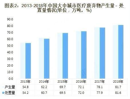 隨著城市化進程加快,我國大中城市醫(yī)療廢棄物產(chǎn)生量與處置量呈逐年上漲態(tài)勢。2018年,我國大中城市醫(yī)廢產(chǎn)生量達81.7萬噸,同比增長4.61%;處置量達81.6萬噸,同比增長4.75%。