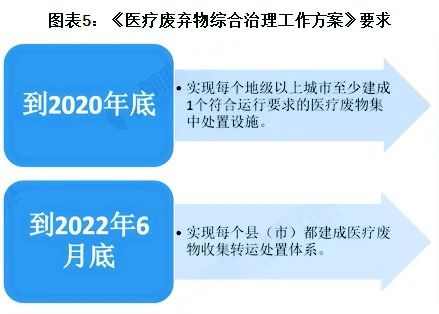2020年2月24日,國家衛(wèi)健委、生態(tài)環(huán)境部等十部委聯(lián)合印發(fā)《醫(yī)療廢棄物綜合治理工作方案》,《方案》要求,要在2020年年底前實現(xiàn)每個地級以上城市至少建成1個符合運行要求的醫(yī)療廢物集中處置設(shè)施;到2022年6月底前,實現(xiàn)每個縣(市)都建成醫(yī)療廢物收集轉(zhuǎn)運處置體系。