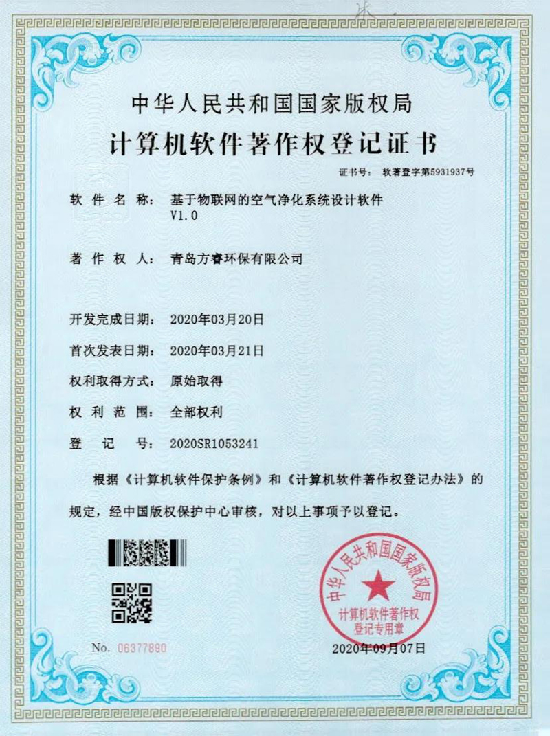 近日,青島方睿環保有限公司在綠天使指導咨詢下順利通過了軟件產品——“基于物聯網的空氣凈化系統設計軟件V1.0”,獲得國家版權局計算機軟件著作權登記證書。