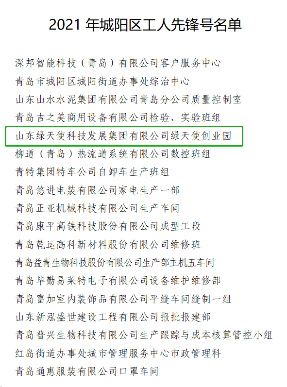 近日,城陽區總工會公布了2021年《關于命名表彰城陽區工人先鋒號和工人先鋒的決定》,山東綠天使科技發展集團有限公司綠天使創業園被授予城陽區“工人先鋒號”先進集體榮譽稱號。